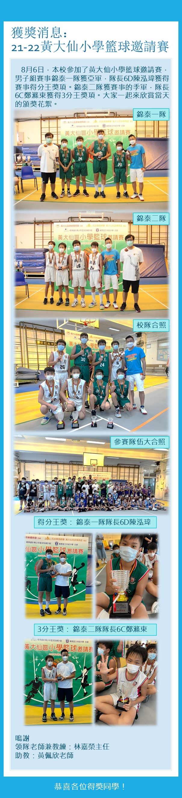 21-22年度黃大仙小學籃球邀請賽獲獎消息